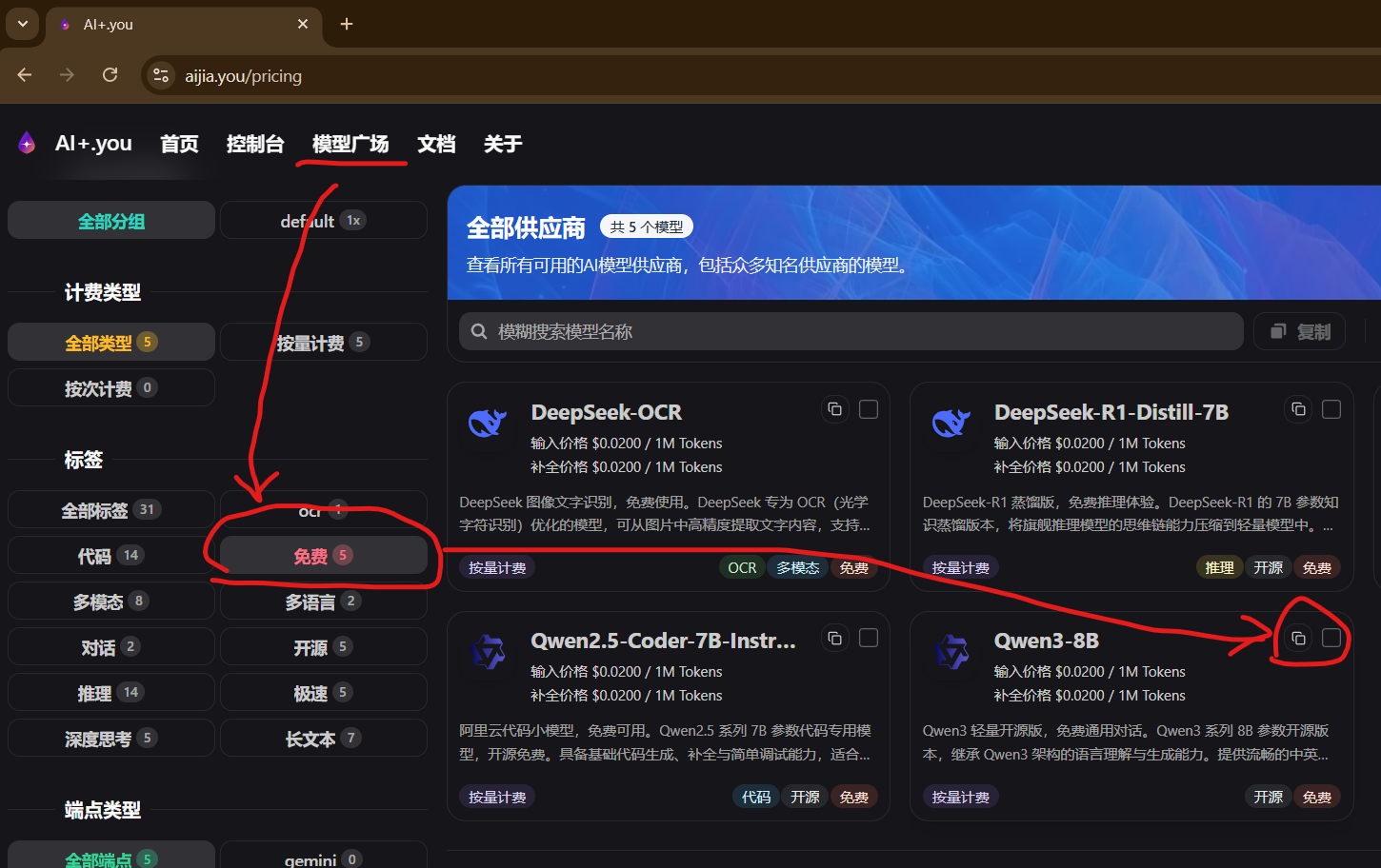 上游目前聚合了四条:阿里百炼、硅基流动、DeepSeek 官方、Gemini 官方。某条上游抖动时自动切换,用户感知不到。当然有发烧友也可以自己玩一玩各种模型,我当前上线了31个模型,其中含5个免费模型(划重点:免费!随便用),这五个模型我全试了,其中 DeepSeek R1 的蒸馏版当真能打,千问开源版也可以的。在模型广场点”免费”的标签就能看到。